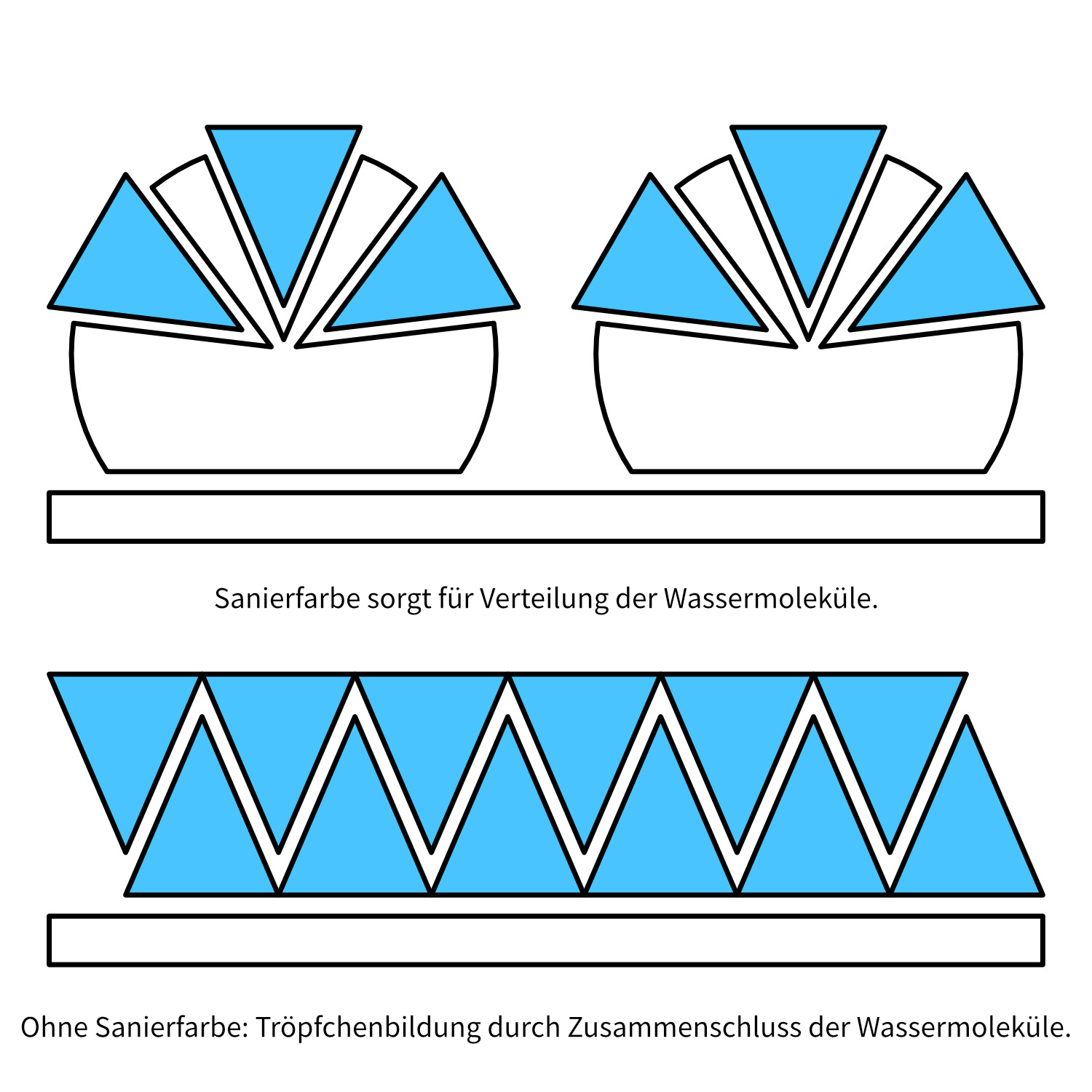 Die grundsätzlich höhere Wandtemperatur wirkt der Kondenswasserbildung entgegen. Zudem adsorbiert die Farbe Wassermoleküle, bevor diese einen Wasserfilm bilden können. Man könnte also sagen, das Wasser verbleibt in der Farbe gelöst, bevor es einen Film ausbilden kann.