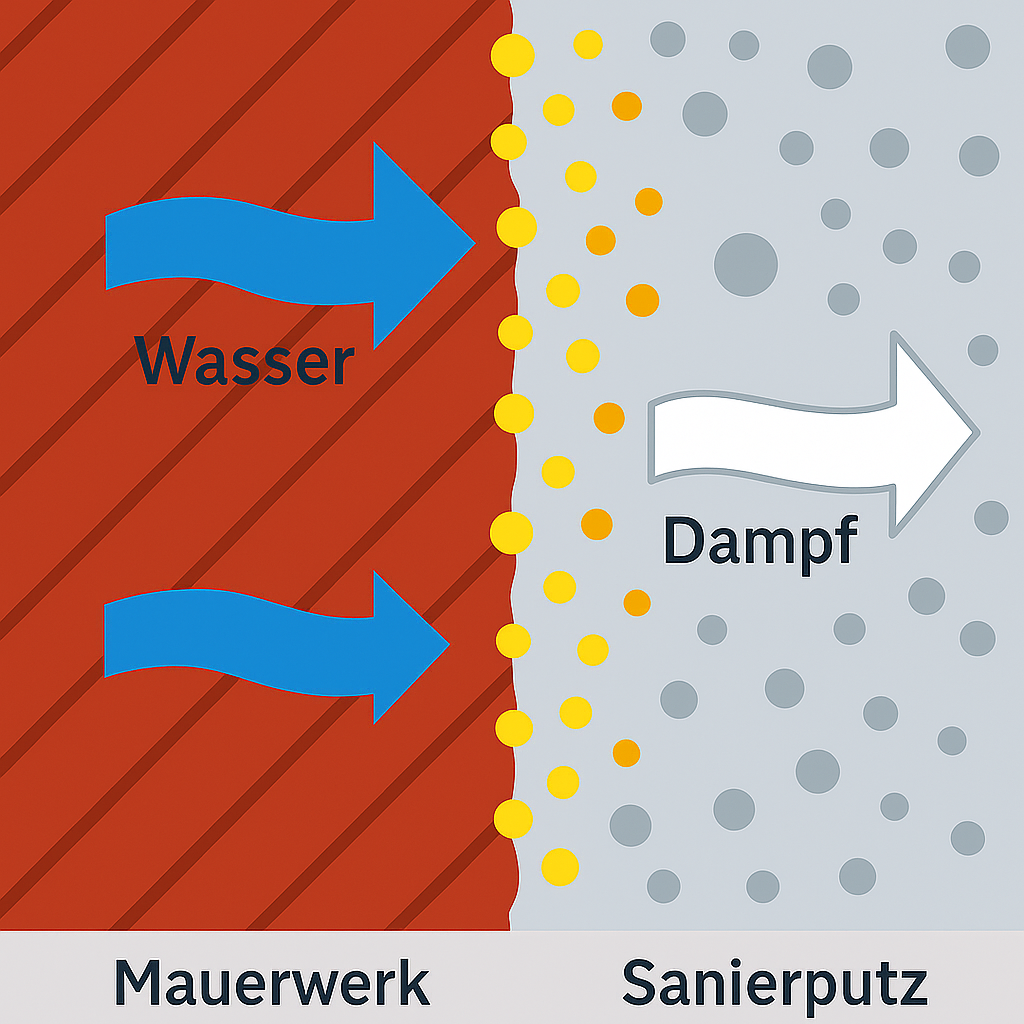 Verlagerung der Verdunstungsebene für im Mauerwerk befindliche Feuchtigkeit von der Putzoberfläche in die Putzschicht. Sanierputze sind wasserabweisend und gleichzeitig hoch diffusionsfähig.