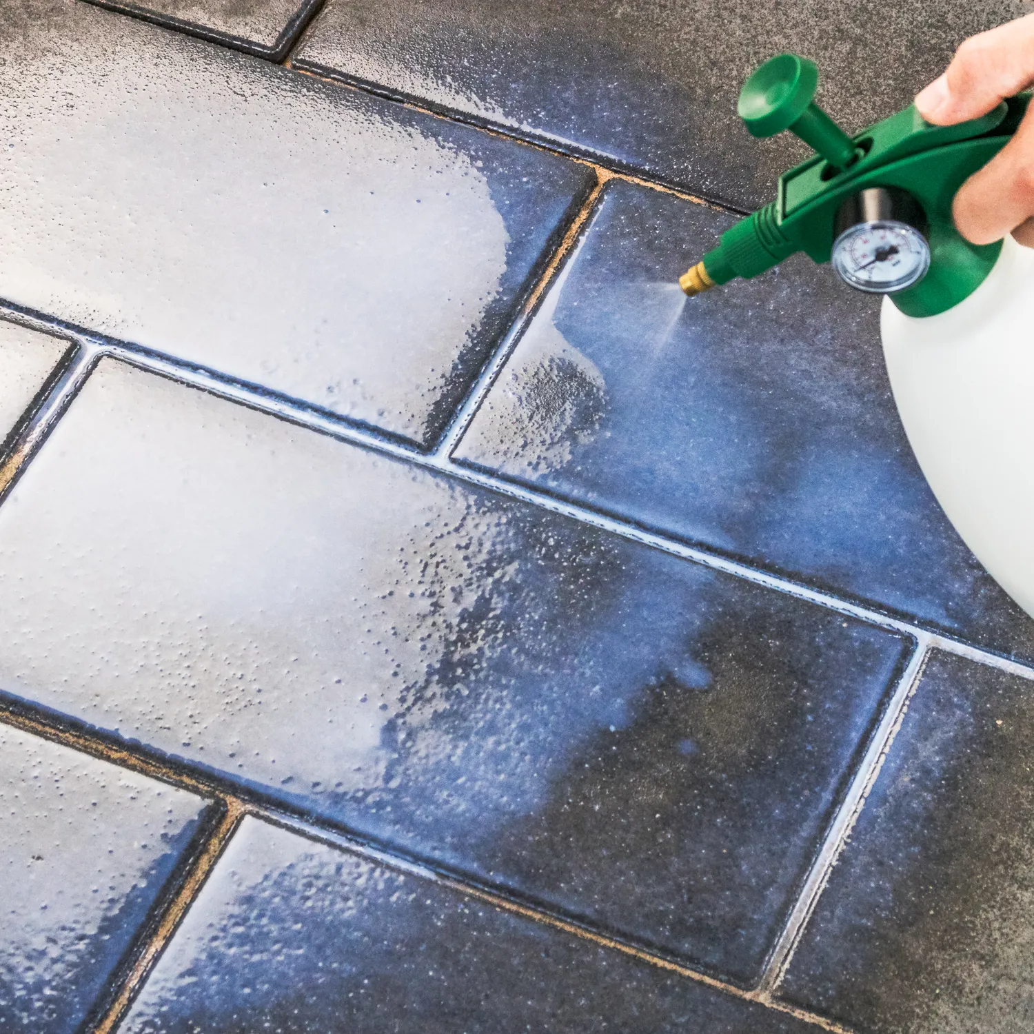 TOBOLIN FUGENFESTIGER kann entweder mithilfe des Fugenaufsatzes direkt in die Fugen appliziert werden oder mit einer Gießkanne oder einem Drucksprüher flächig angewendet werden. Einfaches Ausgießen und verteilen mit einem Gummischieber ist für kleine Flächen auch praktikabel.